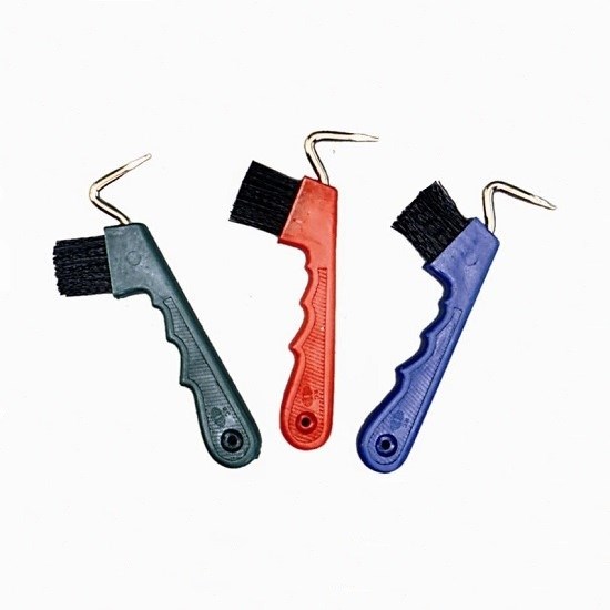 Металлический копытный крючок с жесткой синтетической щеткой с ручкой в пластиковой заливке.