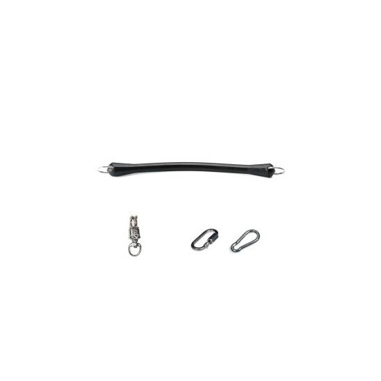 Резиновая развязка с двумя стальными кольцами, к которым пристегнуты карабины(один безопасный Panic, другой вспомогательный груша PEAR).